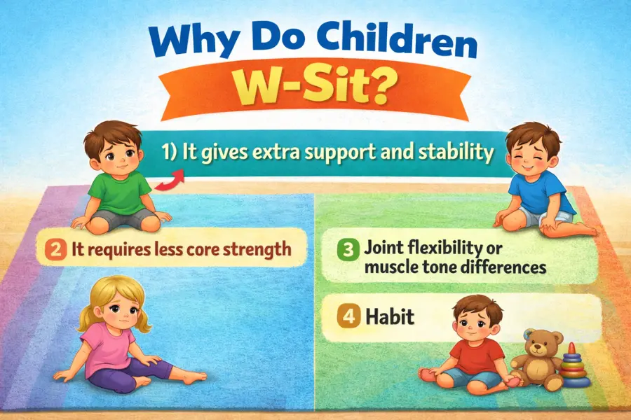 W-sitting creates a very wide base, helping a child stay upright without needing strong balance reactions. If a child feels “wobbly” while sitting cross-legged, W-sitting may feel safer.